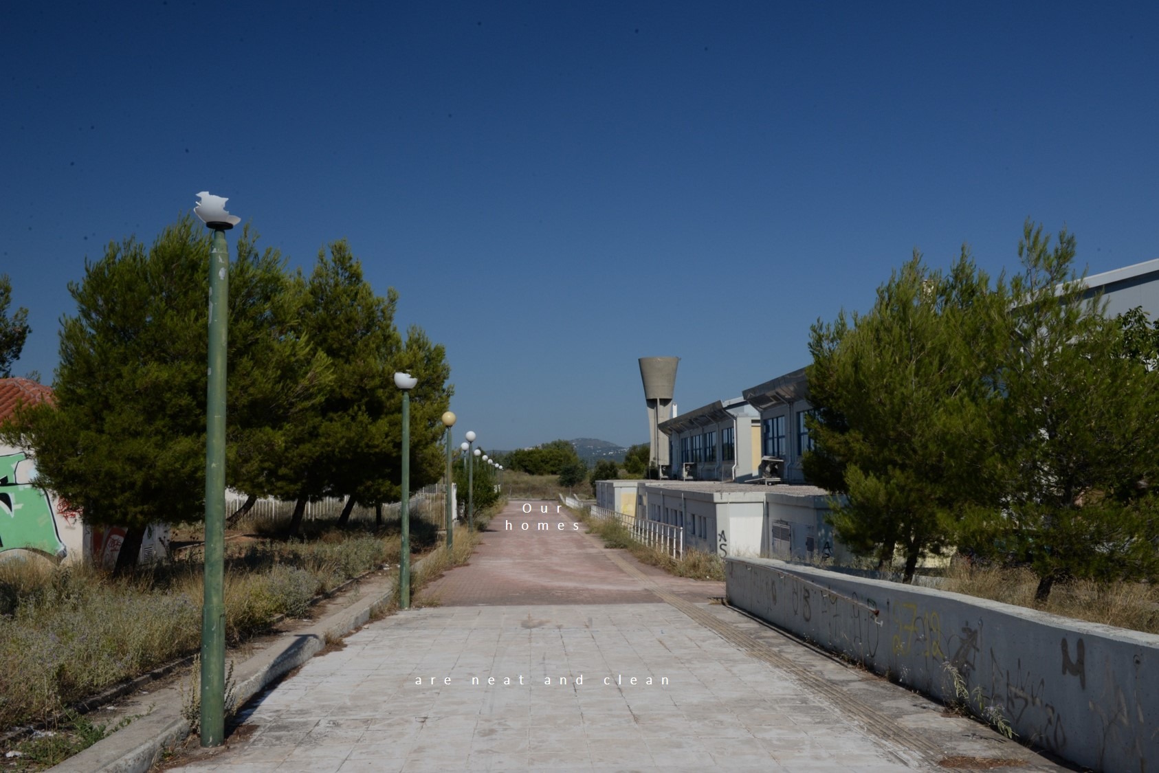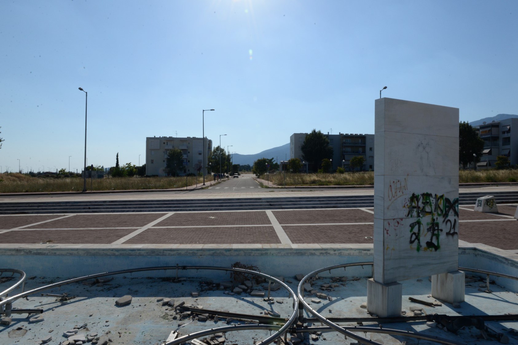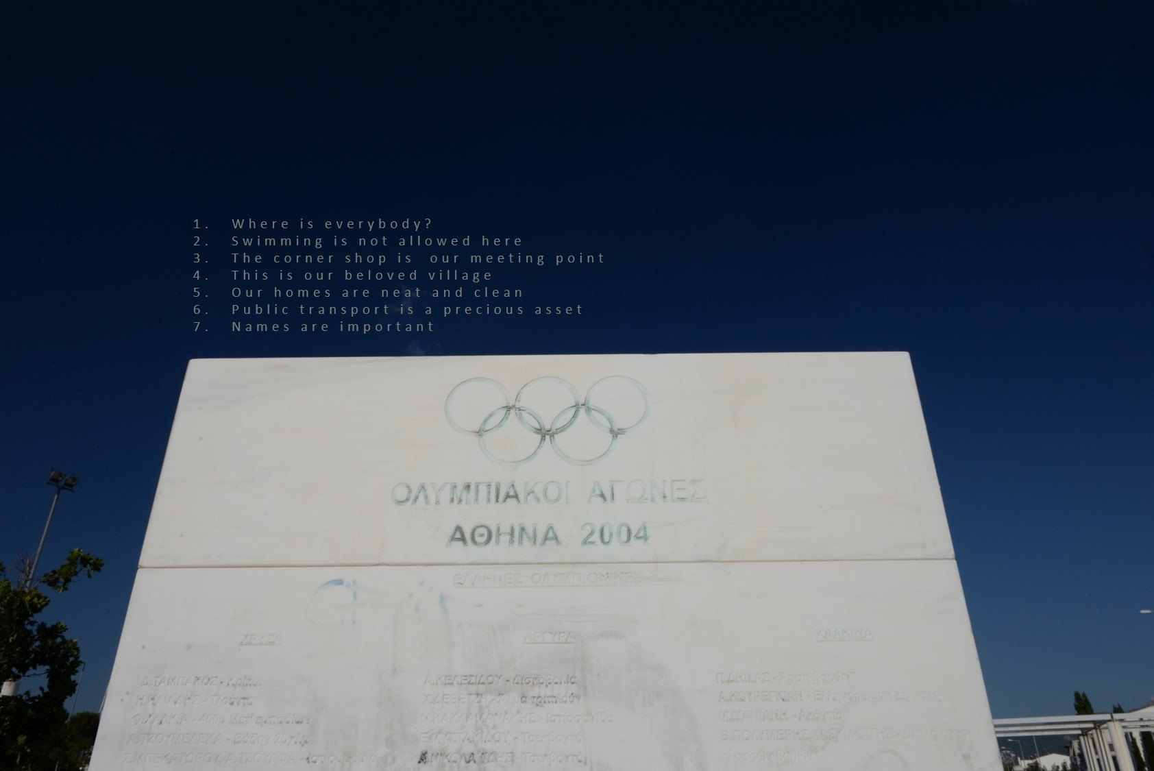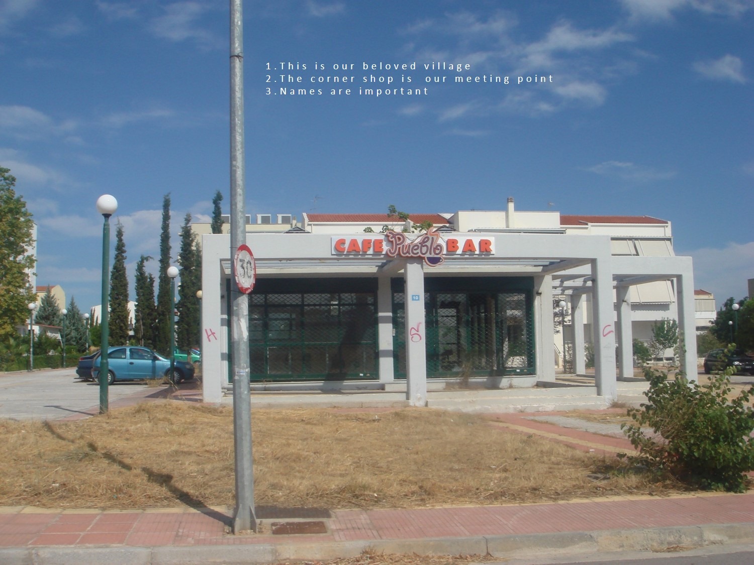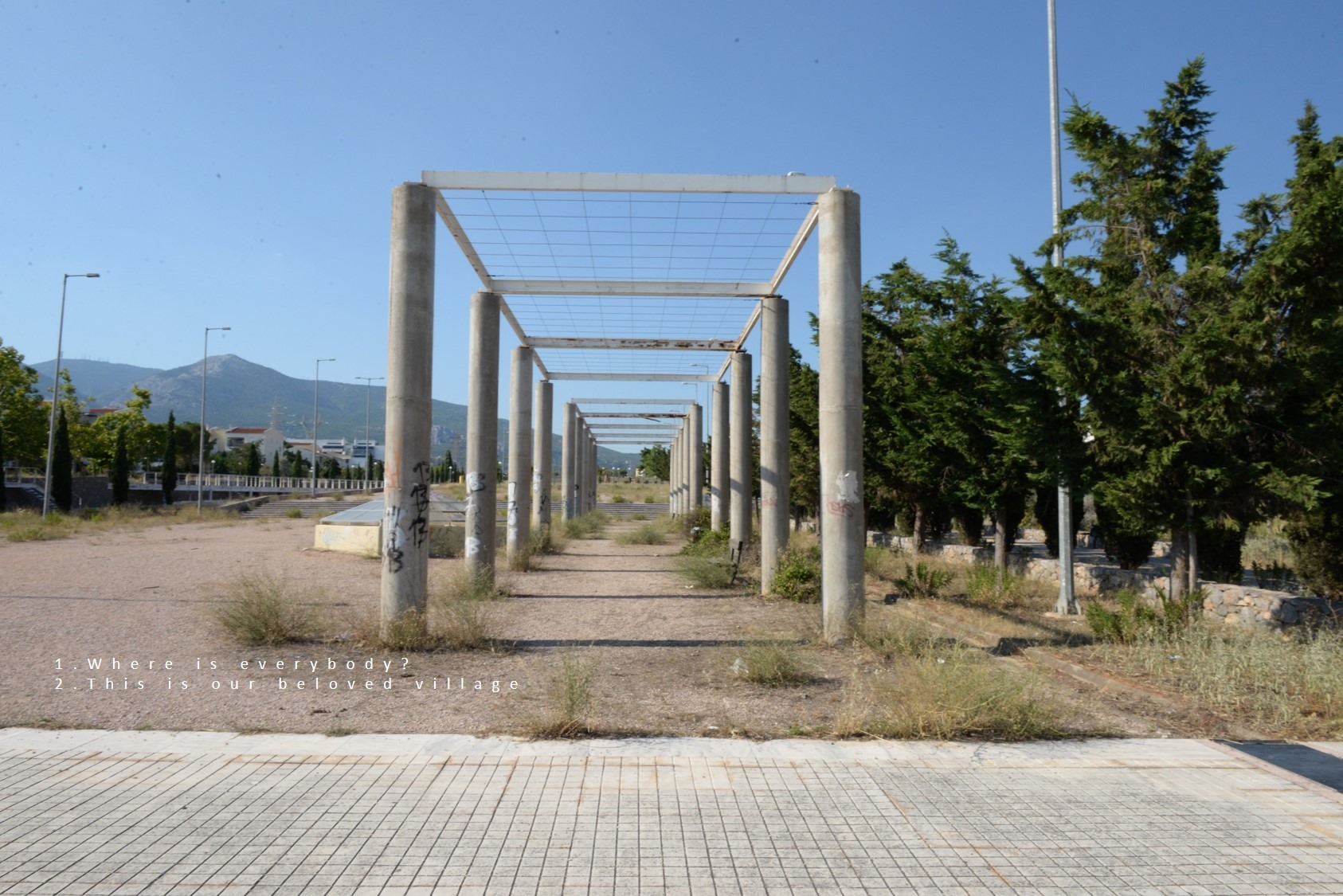 The Olympic village was built on the outskirts of Athens for the purpose of providing adequate housing to the athletes who participated in the 2004 Olympic Games. It’s a beautiful place with fantastic mountain views, plenty of empty space around and quite far from the city. When the Games ended, it was converted into houses for working-class families who bought the properties low rate loans. Many of its public spaces and buildings are not in use. Parks, playgrounds and the swimming pools have been left without maintenance. 2,600 families live here, on streets named after distinguished Greek athletes. Children play outside, everybody is hanging out at the corner shop. There is also a souvlaki joint but no taverns, bars or cafes. There is also a church and a school. Public transport is regular